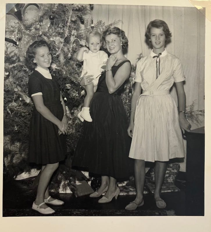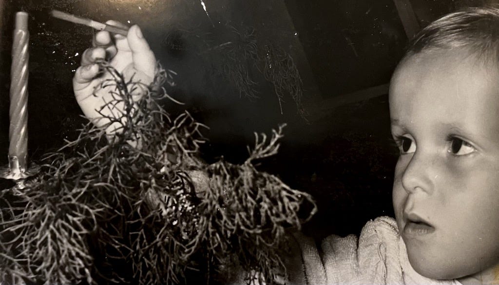 She did not bring much with her from Europe, making each item—a blouse or a bracelet—feel like treasure. A hastily assembled photo album became for us kids, her visual autobiography, made even more alluring because the Bertrand’s spoke French, and Swahili, and only broken English. I was captivated by the black-and white pictures of their Christmas’s in the Congo, cypress tree instead of pine, featuring candles, attached to outer branches with a clip, illuminating the tree.